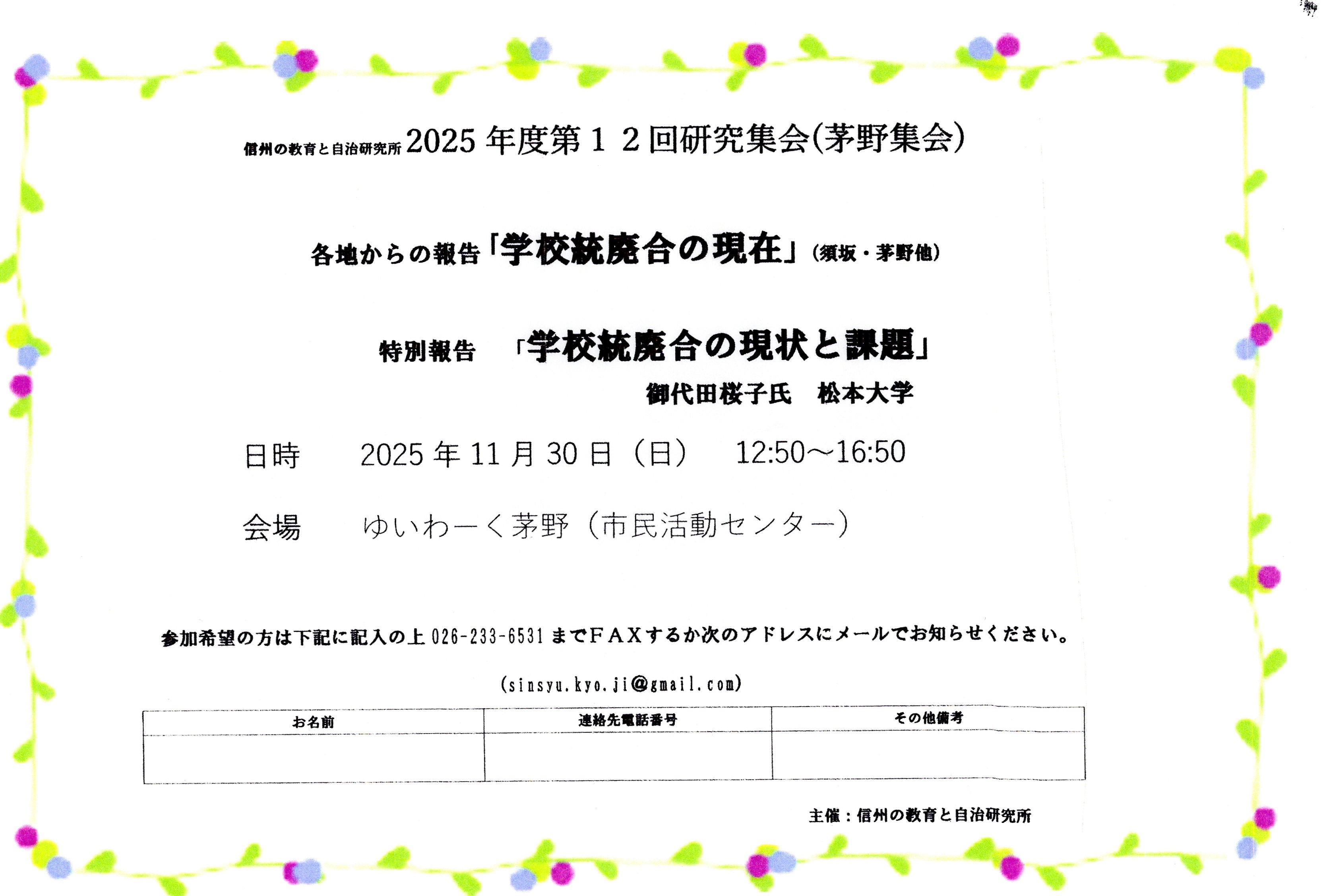 信州の教育と自治研究所は、『憲法を暮らしに生かし郷土信州を真のまほろばに』の大志のもと1982年10月、長野市において創立されました。